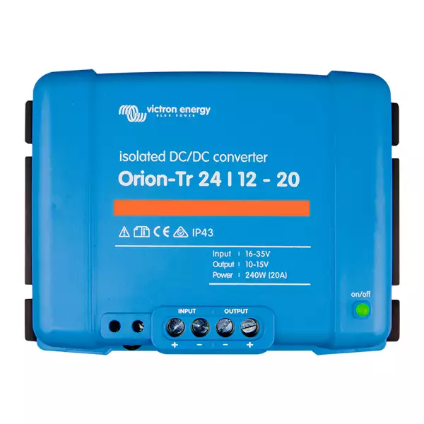 L'abaisseur de tension 24V-12V - 20A de VICTRON ENERGY vous permet de transformer une tension de 24 Volts DC (courant continu) en 12 Volts DC.