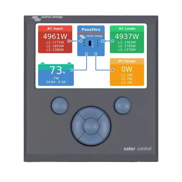 L'Afficheur Digital Color Control GX de VICTRON ENERGY est l'interface de contrôle qui vous permet de superviser l'ensemble des appareils qui lui sont raccordés (comme les ondulateurs/chargeurs, les chargeurs solaires, les batteries, etc ). Avec son portail gratuit de gestion à distance (VRM : Victron Remote Management) vous pouvez tout contrôler par internet depuis n'importe où (par exemple vous pouvez vous assurer que votre bateau est prêt pour le départ). Via l'insertion d'une carte SD cet afficheur garde en mémoire toutes les informations liées à l'installation durant plusieurs années.