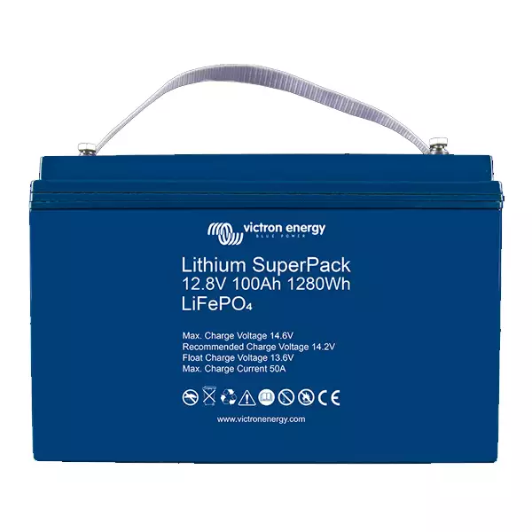 La batterie LiFe-Po4 (Lithium-Fer) - 12,8V 100Ah - Super Pack - High Current de VICTRON ENERY est particulièrement efficiente dans les applications solaires hors réseau et dispose d'un interrupteur interne permettant sa déconnexion en cas de charge excessive ou de température élevée ou basse. Sa technologie au lithium lui procure l'avantage de ne pas avoir besoin d'être complètement chargée, la charge partielle augmentant légèrement sa durée de vie relativement à la charge complète. Attention, elle peut être raccordée à une autre batterie en parallèle et non en série et ne doit être utilisée qu'en position verticale.La batterie a son BMS intégré et ne nécessite donc pas l'achat d'un BMS externe.