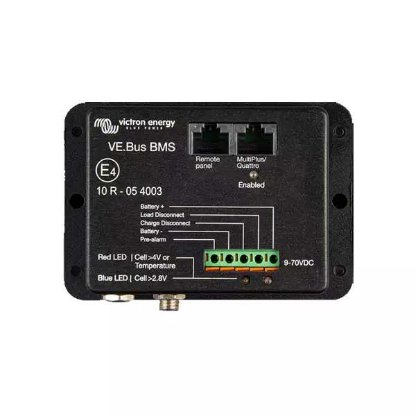 Le BMS (Battery Management System) de VICTRON ENERGY vous permet de contrôler l'état de charge de votre batterie au lithium-fer (LifePO4 ou LFP) et d'en protéger chaque cellule individuelle contre la surtension, la sous-tension ou la surchauffe. Ce système arrête ou déconnecte les charges si ces évènements se produisent. Le BMS protège des systèmes 12V, 24V et 48V et communique avec tous les produits VE.Bus. Sa plage de tension d'exploitation est de 9 à 70 V en courant continu.