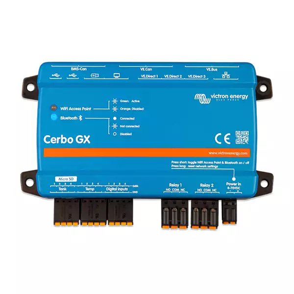 Le Moniteur réseau CERBO GX de VICTRON ENERGY est un centre de communication vous permettant de garder parfaitement le contrôle sur votre système où que vous soyez et ainsi de maximiser ses performances. Pour cela il vous suffit d'accéder à votre système sur le portail Victron Remote Management (VRM) ou d'y accéder en utilisant l'écran accessoire GX Touch, ou par l'application VictronConnect grâce à sa compatibilité Bluetooth. Le GX Touch est un écran accessoire pour le CERBO GX et vous offre une vue d'ensemble instantanée de votre système dont vous pouvez ainsi régler les paramètres. Il se branche facilement au CERBO GX avec un seul câble, il est étanche et s'installe facilement sur le dessus d'un tableau de bord. Vous pouvez également commander et configurer le CERBO GX à distance sur internet à l'aide de la console à distance.